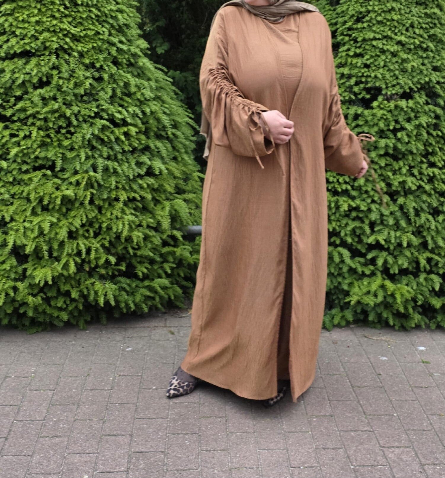 Onze prachtige bruine abaya set met wat glitterende stof. De armen kun je zelf naar je wens instellen